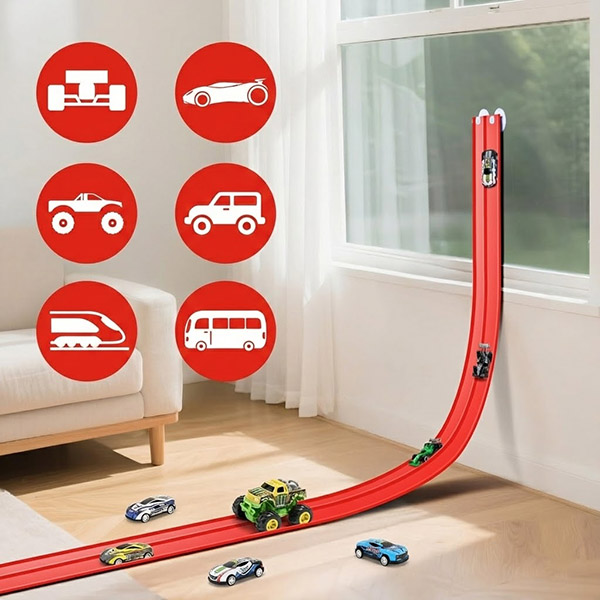 Η στερέωση με βεντούζες επιτρέπει σε παιδιά και γονείς να προσαρμόζουν γρήγορα τις γωνίες και τις διατάξεις, ώστε η πίστα να μπορεί να ξαναχτιστεί πολλές φορές χωρίς εργαλεία ή περίπλοκη εγκατάσταση.