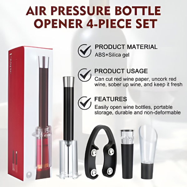 Αυτό το σετ 4-σε-1 περιλαμβάνει ανοιχτήρι με αντλία αέρα, κόφτη αλουμινόχαρτου, ραχέα αεριστή και πώμα κενού για άψογη εμπειρία κρασιού.