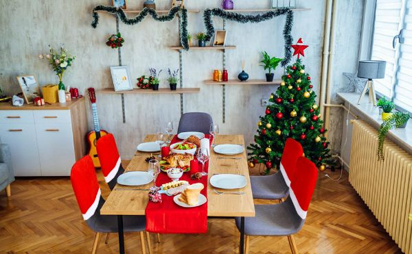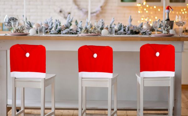 που προορίζονται για διακόσμηση καρεκλών με θέμα τα Χριστούγεννα σε τραπεζαρία.